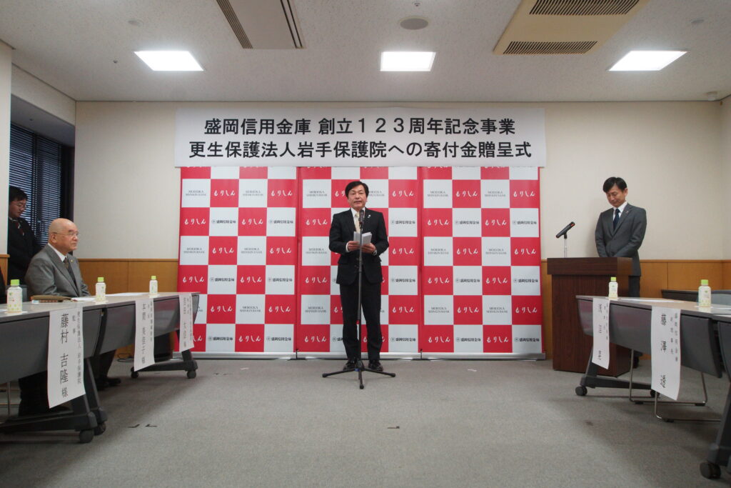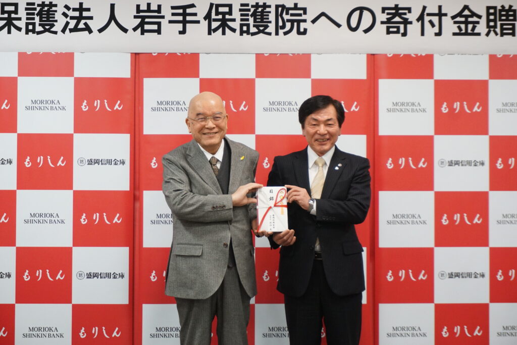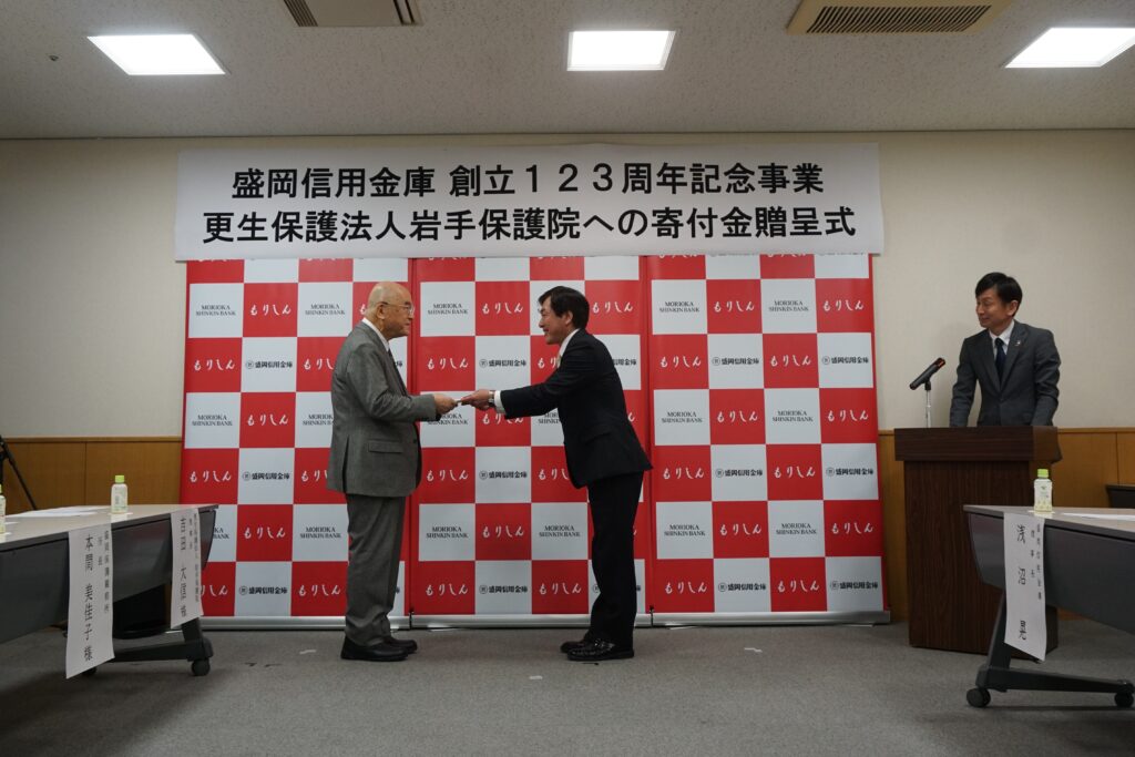 令和8年1月19日(月)「プラザおでって」にて、盛岡信用金庫 創立123周年記念事業として、更生保護法人岩手保護院への寄付金贈呈式が行われ、盛岡信用金庫 浅沼 晃理事長から、岩手保護院吉田理事長へ目録が授与されました。浅沼理事長は、「罪を犯した人達を社会から切り離すのではなく、更生しようとする姿勢を後押しする社会でなければなりません。」と挨拶で述べられました。吉田理事長は、「この度のご支援を糧に、地域の中で多くの方々に支えられながら、犯罪や非行をした人の改善更生の支援に努めてまいります。」と決意を述べました。更生保護法人岩手保護院は、御承知のとおり、民間の施設であり、多くの皆様からのご支援を賜り活動しています。盛岡信用金庫様 大変ありがとうございました。
